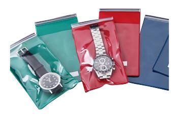 ウォッチバック(ポケット付) 寸法:170×90mm カラー:4色 50枚入 時計に最適な厚手ビニール袋です。片面に保証書や預り証が入れられます。 |