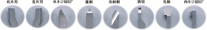ハイスバーを刃形状に加工した総型です。それぞれ切りくずの逃がし加工を行ってあり、小型