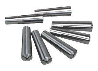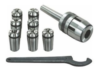 コレットホルダーセット(MT-3) No.60750 エンドミルやドリルをスピンドルに固定するために用いる器具。コレットホルダーとコレットチャックのセット。コレットホルダーをスピンドルに差し込んで引きネジで引いて固定し、ホルダーのキャップを外して、ドリルやエンドミルの径に適合するコレットに交換して使う器具です。 |