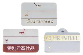 タグ付紙製値札 定番のタグ付値札各種です。 3種類、各50枚入 A、レッド /450円(税別) B、ゴールド/680円(税別) C、ゴールド/680円(税別) |
