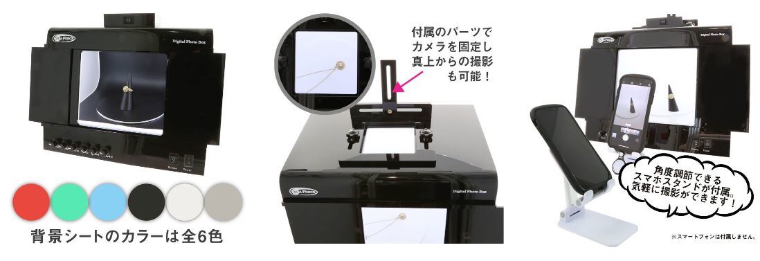 付属品 | ACアダプタ、カメラ固定用ガスケット スマホスタンド、背景シート(6色)、説明書 |