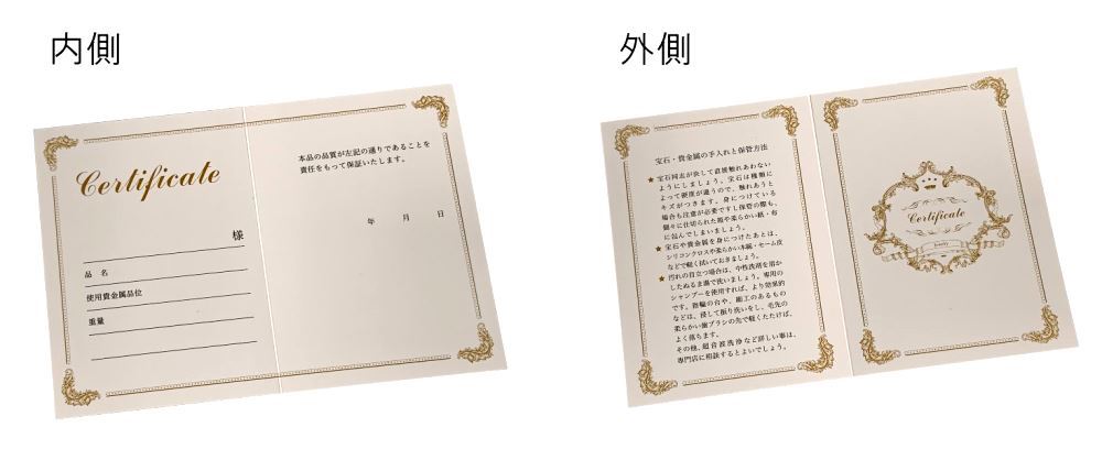 ジュエリー、宝石販売時に使用する専用の保証書です。