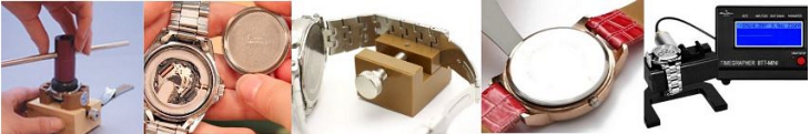 タイムグラファー、ロレックスやオメガの裏ふたオープナー、ベルト調整など腕時計の工具、機器類です。超音波洗浄器やバフ研磨機器、時計修理机などです。