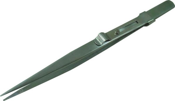 細かいパーツの保持や加工補助に最適なピンセットです。先端にすべり止めのローレット付です。