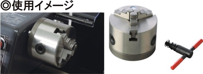 三爪チャックΦ80mm No.66009 標準付属の三爪スクロールチャックと同等品。主に旋盤用のワークピース(材料)を把握するのに用いる器具です。付属のチャックハンドルを使って操作すると、三つの爪が連動して可動し把握が簡単です。逆爪も付属し大径の材料の把握も可能。丸棒や三角柱、六角柱の形状に適しています。他にフライス盤用のロータリーテーブルと併用して加工の幅をひろげます。 |