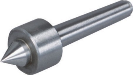 回転センター(MT-1) No.66015 標準付属のレースセンターを高速回転で使用すると摩擦熱で焼き付く恐れがあるため、ベアリングが内蔵された回転センターを用いる事で焼き付きを防止する。また、材料が硬質の場合も回転センターを用いる。 |