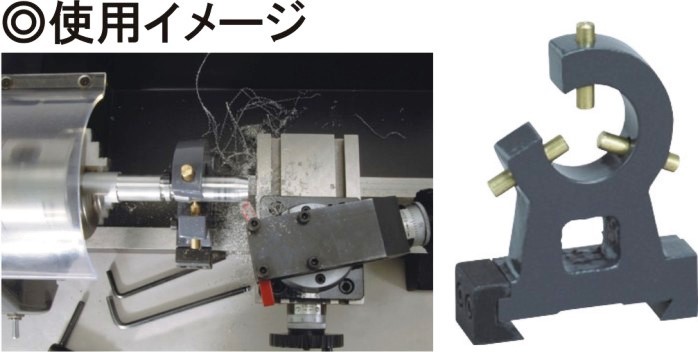 移動振止 No.66031 細長い材料や軟材質の材料を加工する際に、刃に押されて逃げるのを防止するためのアタッチメント。クロススライドの側面に固定するため、刃物台と同時に移動します。円筒切削用の器具です。 |