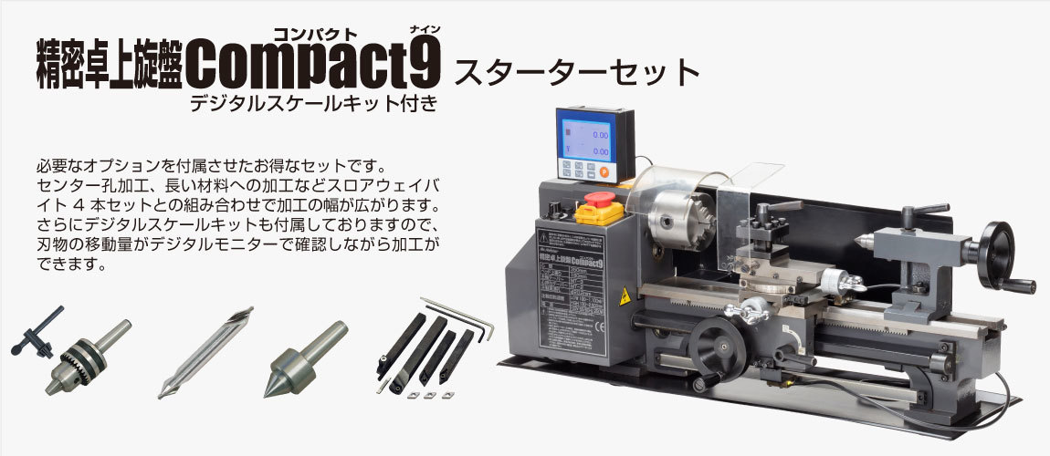 | 製品仕様 | スターターセット、COMPACT9(コンパクト9)精密卓上旋盤 (デジタルスケールキット付) |