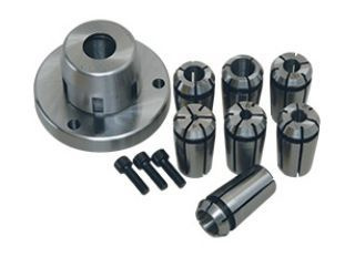 主軸用コレットホルダーセット No.60520 主軸に取り付けて小物を把握するためのアタッチメントです。材料の直径に合わせたコレットチャックを併用します。その他ロータリーテーブル用のアタッチメントとしても使用できます。 |