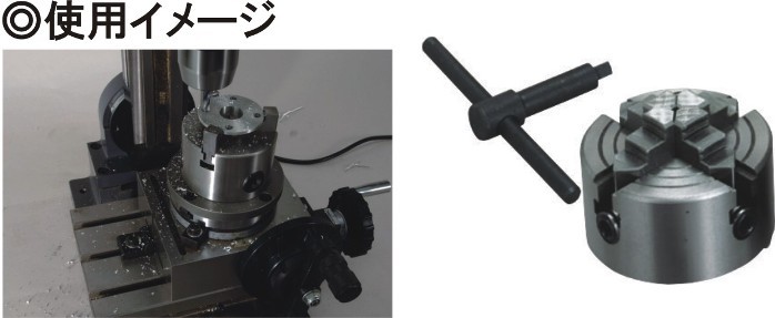 四爪チャックΦ80mm No.66010 四爪インディペンデントチャックは、四角材や台形材等の把握に用いる器具です。4つの爪がそれぞれ独立して可動するため、円筒材の心出にも適しています。ロータリーテーブルに取り付けて使用します。 |