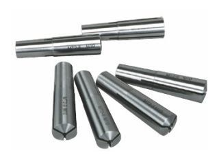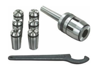 コレットホルダーセット (MT-2) No.66240 エンドミルやドリルをスピンドルに固定するために用いる器具。コレットホルダーとコレットチャックのセット。コレットホルダーをスピンドルに差し込んで引きネジで引いて固定し、ホルダーのキャップを外して、ドリルやエンドミルの径に適合するコレットに交換して使う器具です。 |