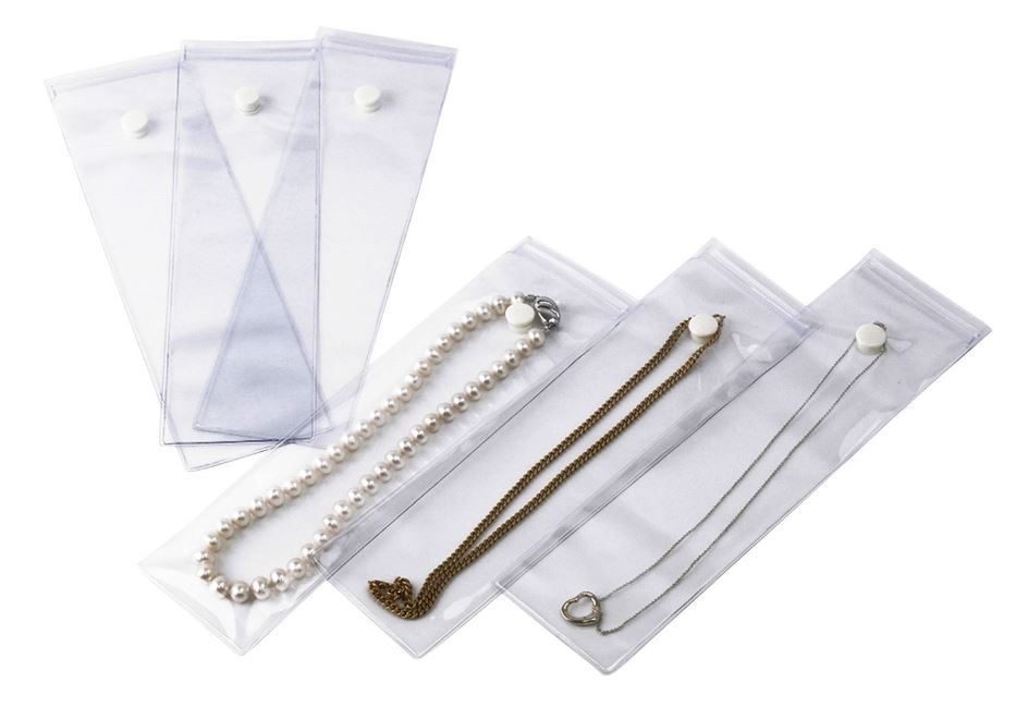 台紙付きネックレス用ビニール袋 寸法:250×70×0.2mm (10枚入) 厚手のチャック付ビニール袋に専用台紙を組み込んでるのでネックレスなどがキレイに収まります。 2,300円(税別) |