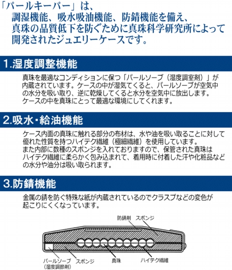 真珠に最低な環境で保管ができるケースです。湿度調整剤、防錆剤を内臓しており、さらに吸水効果