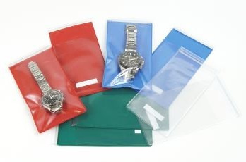 ウォッチバック(ポケット付) 寸法:170×90mm カラー:4色 50枚入 時計に最適な厚手ビニール袋です。片面に保証書や預り証が入れられます。 |