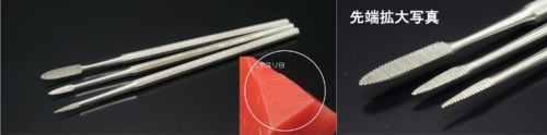 先細の切削ヤスリです。樹脂加工、ワックス形成の細かい作業にお使いいただけます。